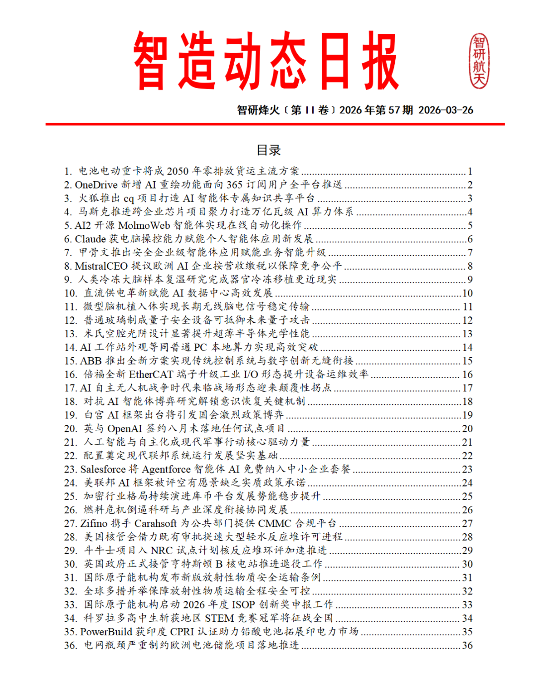 聚焦全球智能制造领域的权威情报产品,每日精选航空技术与应用人工智能、工业机器人、增材制造、芯片工艺等核心技术突破与产业动态,以结构化、可编辑的文档形式呈现。内容涵盖技术解析、企业战略及政策影响,依托资深专家团队及强大的开源情报处理能力,助力企业快速捕捉技术趋势与市场机遇,把握智造脉搏,引领产业升级。