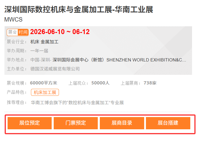 深圳国际数控机床与金属加工展-华南工业展(MWCS)是华南工博会旗下的“数控机床与金属加工”专业展。在数字化变革的时代,金属加工行业将占据主导地位。诸如新能源汽车、5G通讯、数字工厂、增材制造等关键主题将是推动新工艺及新技术前进的重要动力。在MWCS您将见证关于知识、信息和技术的互联互通,包含规划、控制和物流在内的制造过程数字化将在现场得到充分演绎。
