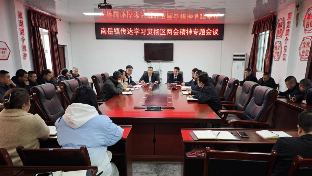 会议要求,一要深学细悟,迅速统一思想凝聚共识。要把学习贯彻区两会精神作为重要任务,通过专题会议、院坝会等多种形式,组织全镇党员干部全面把握会议核心要义,特别是关于乡村振兴、产业发展、基层治理等方面的部署要求,引导全镇上下深刻认识南岳在全区发展中的方位与责任,切实将思想和行动统一到区委、区政府决策部署上来。二要精准对标,系统谋划镇域发展路径。要紧扣区两会确定的目标任务,立足南岳资源禀赋和产业基础,聚焦特色种植养殖、农旅融合、场镇功能提升、人居环境整治等重点领域,制定翔实落实方案,将区级“规划图”细化为南岳“任务书”“路线图”,并明确责任与时限,确保各项部署在南岳有抓手、能落地、可见效。三要实干担当,全力推动工作落地见效。要以学习贯彻两会精神为契机,进一步强化干部队伍建设,班子成员要带头深入一线解决问题,全体党员干部要主动亮身份、作表率,在产业发展、服务群众、乡村治理中积极作为。健全重点任务督查机制,以钉钉子精神狠抓落实,奋力开创南岳镇经济社会高质量发展新局面。