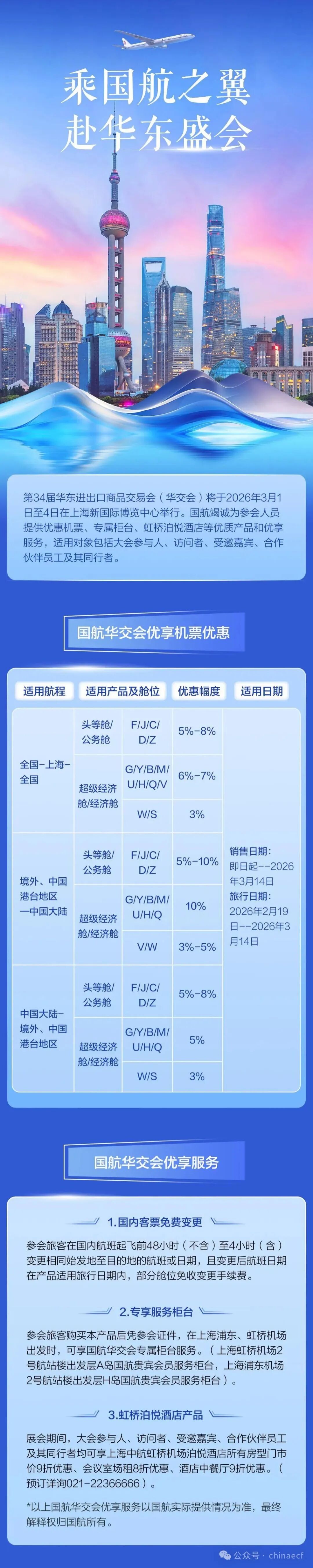 国航竭诚为第34届华交会参会人员提供优惠机票、专属柜台、虹桥泊悦酒店等优质产品和优享服务,适用对象包括大会参与人、访问者、受邀嘉宾、合作伙伴员工及其同行者。