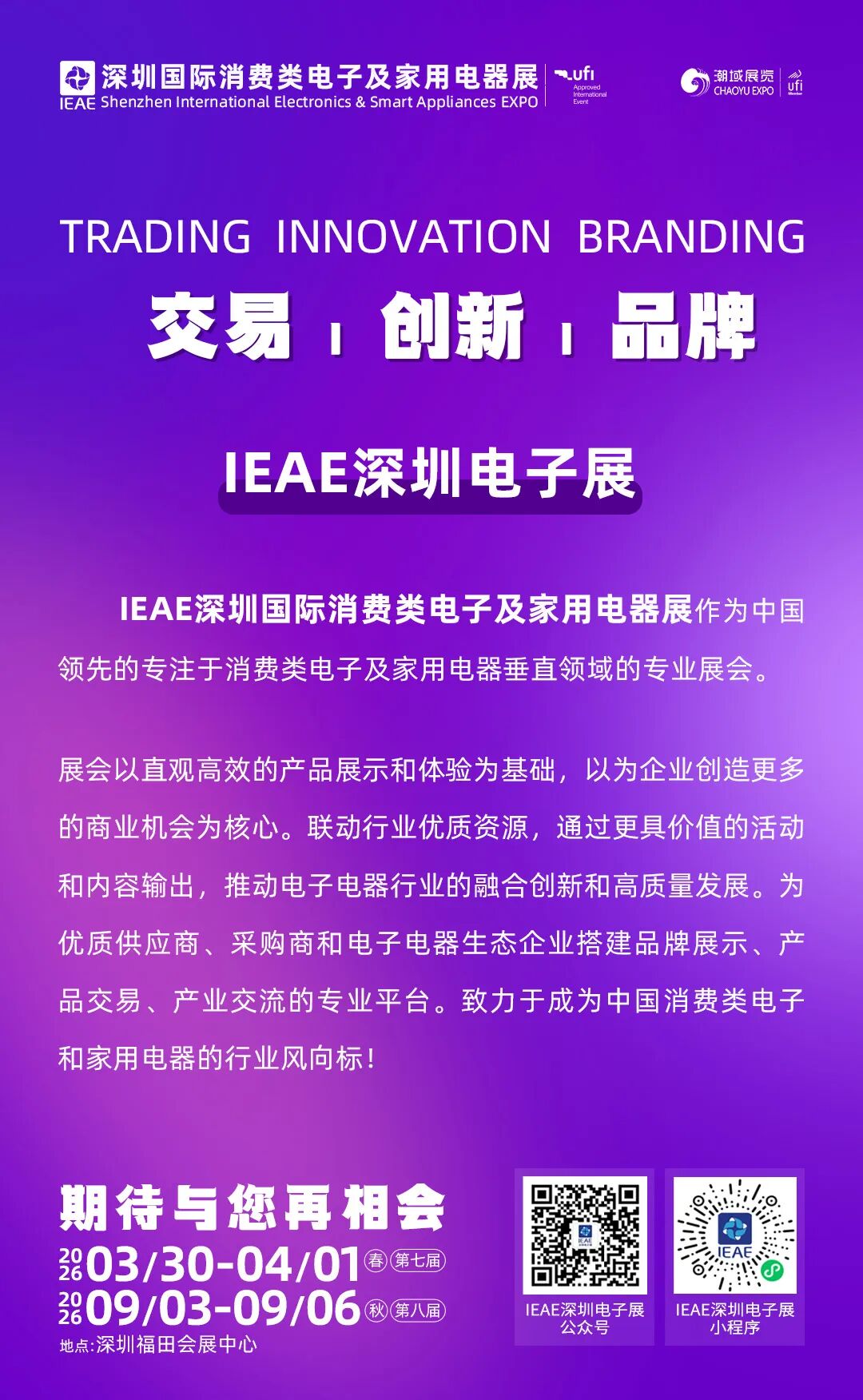 由广东电子商会支持、广东潮域展览有限公司、广东潮域科技有限公司主办、深圳潮域展览有限公司承办的“第七届IEAE深圳国际消费类电子及家用电器展”,将于2026年3月30-4月1日在深圳福田会展中心盛大启幕,全面展现电子电器行业的科技生态与发展新趋势。