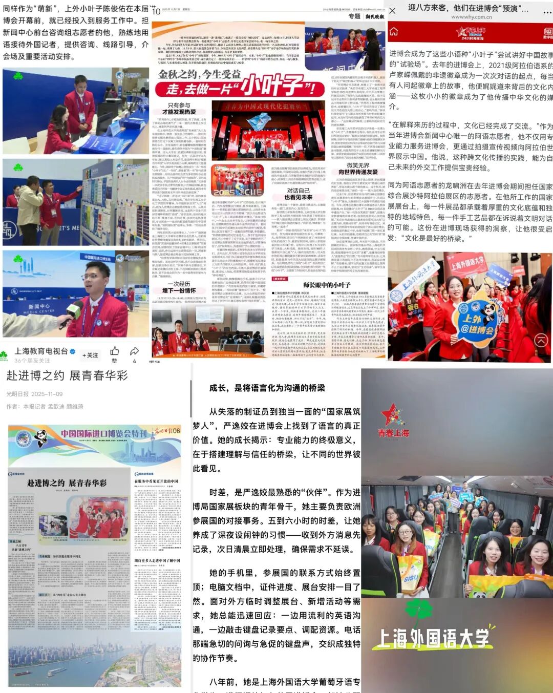 在服务进博的征程中,“小叶子”不仅提升了自我,更缔结了深厚情谊。岗位上的默契配合,工作时的互帮互助,让这个集体始终洋溢着温暖。他们自信的微笑、流畅的多语沟通与挺拔的身姿,成为“四叶草”中一道动人的风景,赢得了各方嘉宾的广泛赞誉,同时也受到了新华社、光明日报、中国青年报、上海发布、新民晚报、上海教育电视台、青年报等媒体的关注和报道。