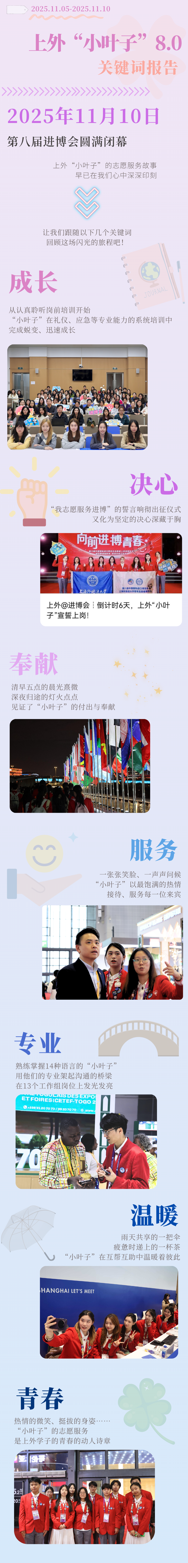 进博有期,情谊无限。第八届进博会虽已落幕,但中国高水平对外开放步伐不停歇,上外“小叶子”将继续秉持“奉献、友爱、互助、进步”的志愿精神,在全球治理和国际交往的更大舞台上,展现新时代中国青年的卓越风采。