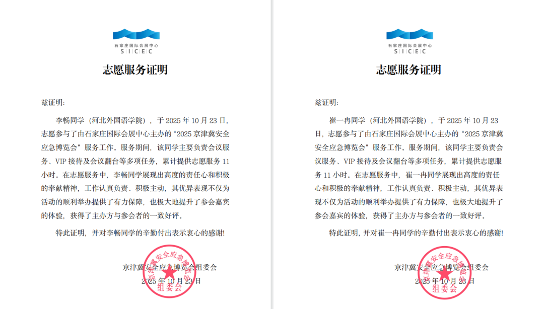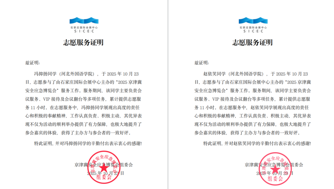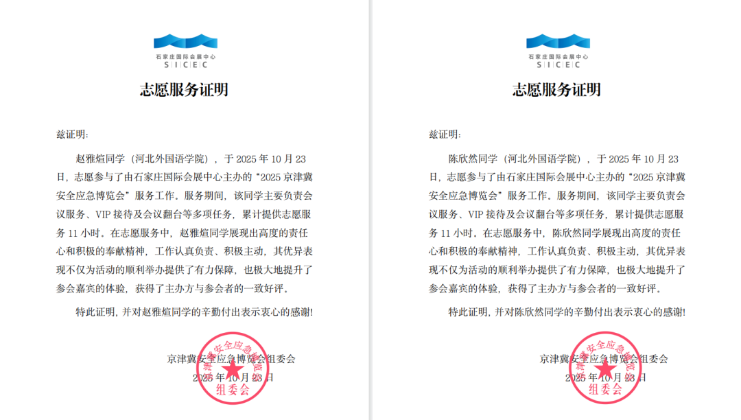 2025年10月23日,由石家庄国际会展中心主办的“2025京津冀安全应急博览会”在石家庄盛大启幕。河北外国语学院国际航空旅游学院六名学子(23空本二陈欣然、25会展冯抑扬、24会展崔一冉、24空本一赵雅煊、25会展李畅、25会展赵依笑)受邀参与展会服务工作,以扎实的专业素养和高效的服务能力,为展会顺利开展贡献青春力量,并赢得主办方及场馆方的一致好评。