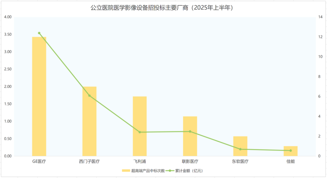 而医学影像领域头部企业展开的新一轮技术较量,超高端产品似乎成为市场决胜的关键赛道。从2025年上半年超高端医疗设备项目的中标情况来看,GE医疗、西门子医疗、飞利浦位列前三。