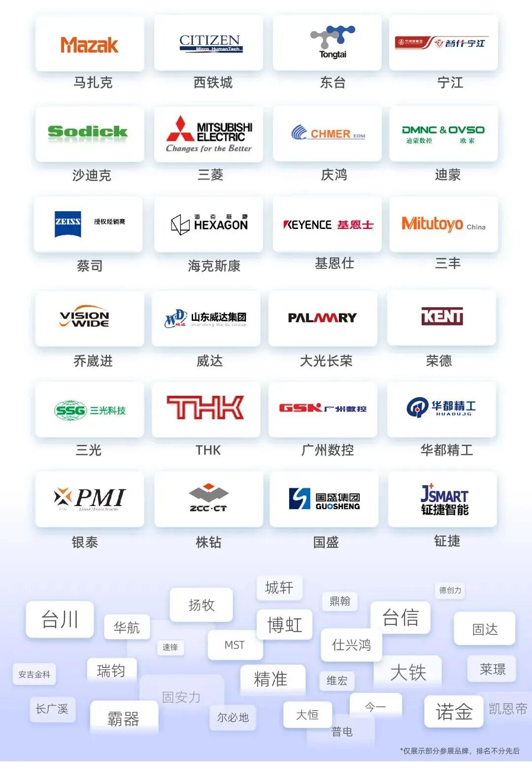 马扎克、西铁城、沙迪克、东台、蔡司、海克斯康、国盛、大光长荣、荣德、宁江、乔崴进、威达、三菱、庆鸿、迪蒙、三光、银泰、广州数控、THK、株钻、三丰、基恩仕、华都精工、MST等1500+展商强势集结,集中展出先进设备和行业解决方案。