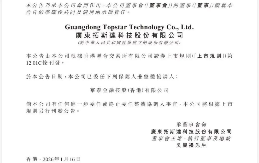 A股工业机器人赛道的老兵广东拓斯达科技股份有限公司,正快速启动其“A+H”双资本平台战略。公司已于2026年1月16日正式向港交所递交上市申请书,由华泰国际担任独家保荐人。而就在递表前一天,公司股东会刚以高效率审议通过了上市相关的一系列议案。作为深耕智能制造领域多年的公司,其A股总市值已达158.78亿元,此时赴港被市场解读为意图借国际资本市场之力,加速其向“具身智能”等前沿技术战略升级。