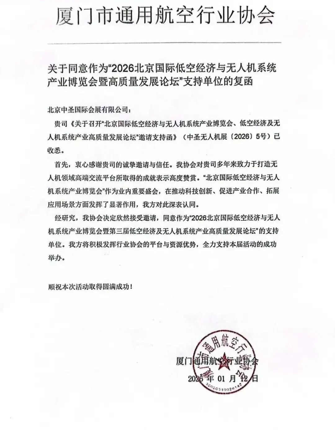 厦门市通用航空行业协会关于同意作为"2026北京国际低空经济与无人机系统产业博览会暨高质量发展论坛"支持单位的复函