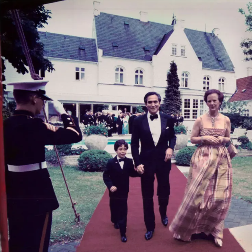 大使约翰·L·洛布二世(中)和他年幼的儿子尼古拉斯在丹麦官方大使官邸举办的晚宴上护送丹麦女王玛格丽特二世。