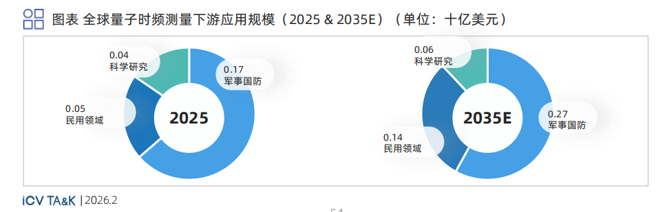 军事国防是量子时频测量的核心支撑 ,2035年市场规模将达2.7亿美元 ,持续服务于卫星导航与战略通信 。民用领域 ,通信基站同步 、金融时间戳及电力调度等应用构成稳定需求 ,而光学钟/核钟等技术将贡献中长期增量。