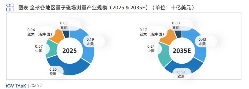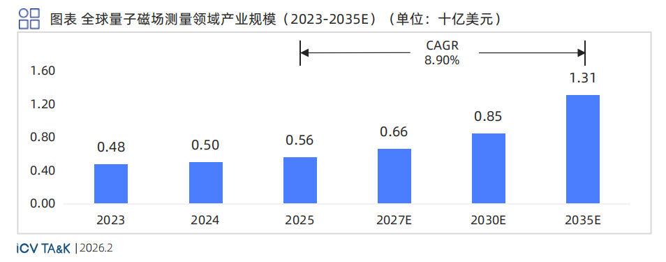 磁场测量在生物磁成像和国防领域应用深厚 ,2035年总产业规模预估为13.1亿美元。