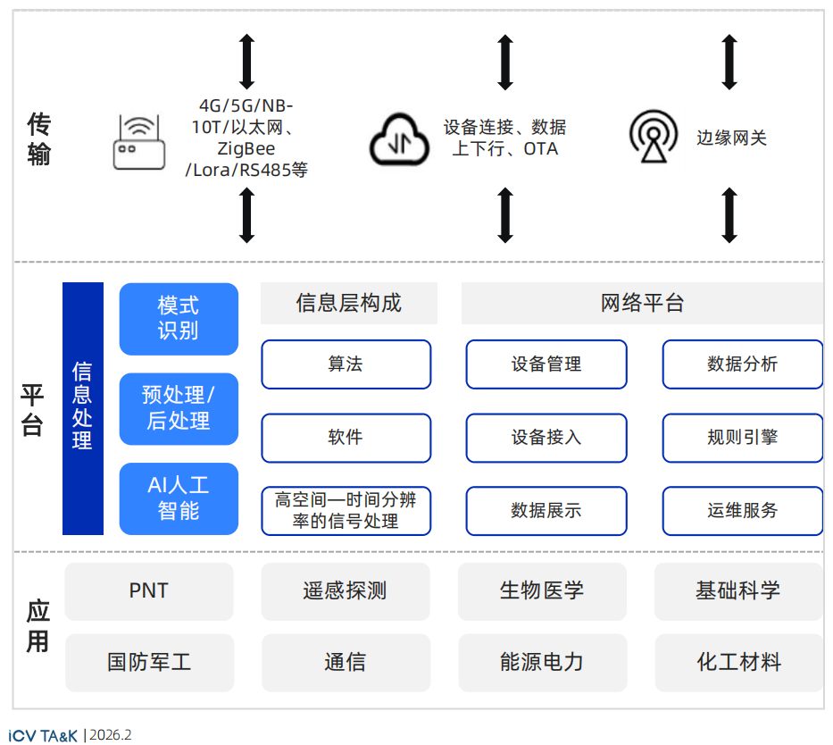 > 传输层:作为数据传输通道 ,主要负责将量子传感设备采集到的信息和数据传输到平台层进行处理和储存。