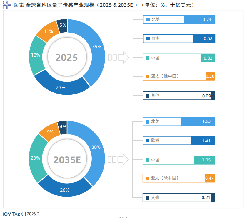 预计到2035年全球量子传感产业规模将上升至50.7亿美元 ,意味着该行业在十年内的产值增幅接近2 .7倍 。伴随整体规模的扩张, 中国市场的份额预计增长至22.68% ,其扩张速度高于全球平均水平 。北美地区虽然份额轻微下调至38.12% ,但依然维持着全球最大的市场基数 。欧洲份额也将调整为25.83% ,而亚太其他地区和其他地区分别为9.21%和4.16%。