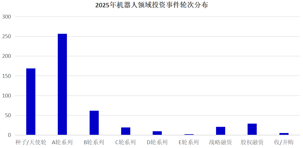从融资轮次看,“投早投小”与“扶优扶强”的双重趋势并行。一方面,早期投资依然活跃。种子轮、天使轮及 A 轮融资事件合计426起,占总事件数的74%,;另一方面,中后期大规模融资事件频现,成为拉升总规模的关键。