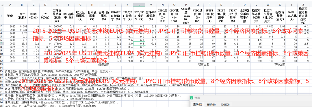 问题三 2015-2025年 USDT (美元挂钩)EURS (欧元挂钩)    JPYC (日币挂钩)货币数量,8个经济因素指标、8个政策因素指标、5个市场因素指标2015-2025年逐年具体数值数据