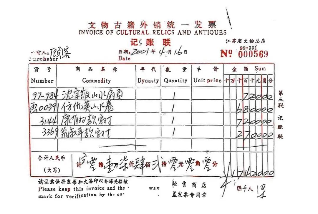2001年,以6800元作为《仿仇英山水卷》售出,发票齐全,买家栏写“顾客”。材料齐备,流程完整,时间清晰。