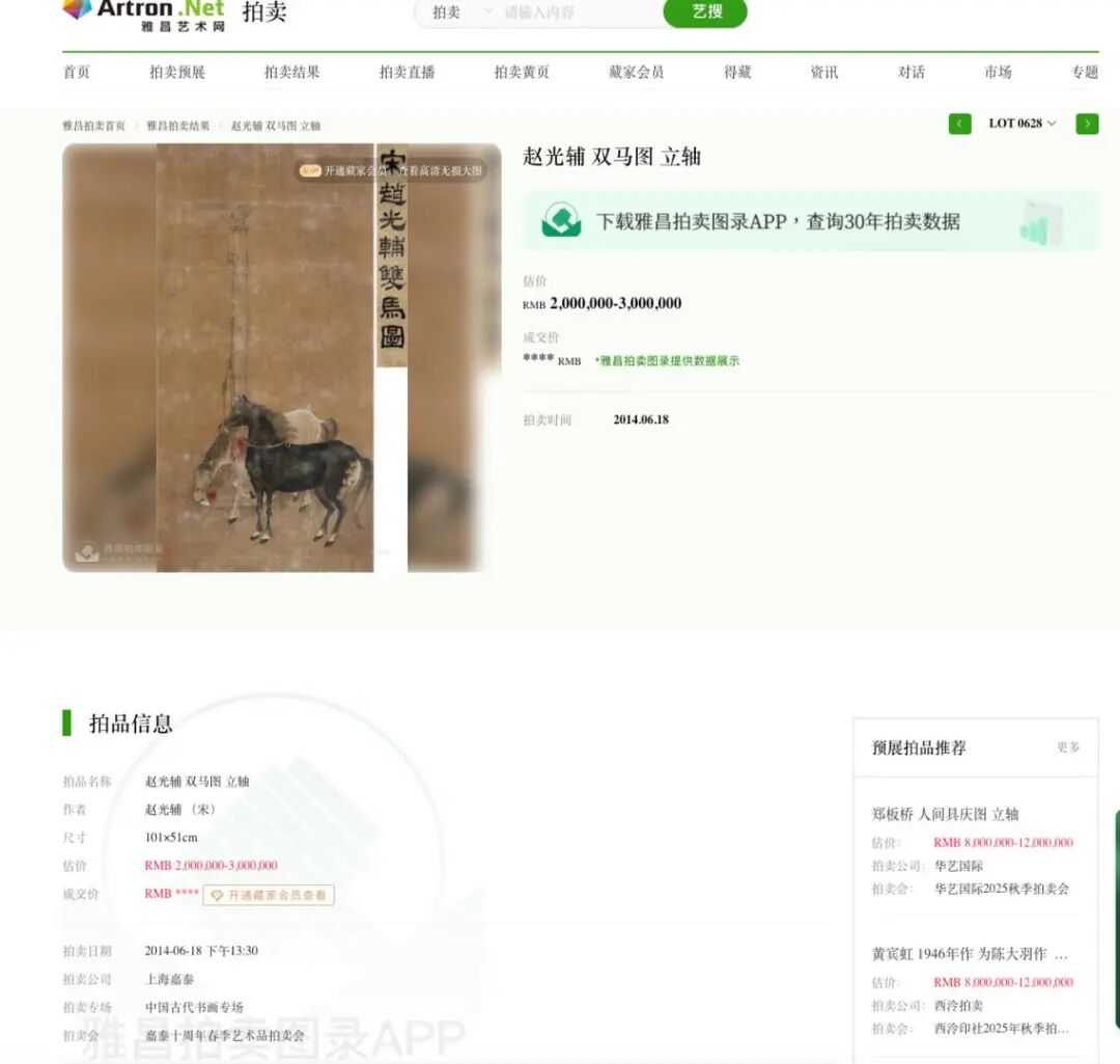 值得注意的是,2014年6月18日,上海嘉泰拍卖行以230万元拍出北宋赵光辅《双马图立轴》。