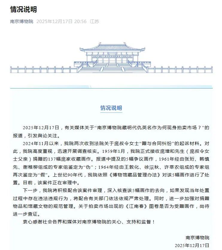 南京博物院12月17日发布情况说明: