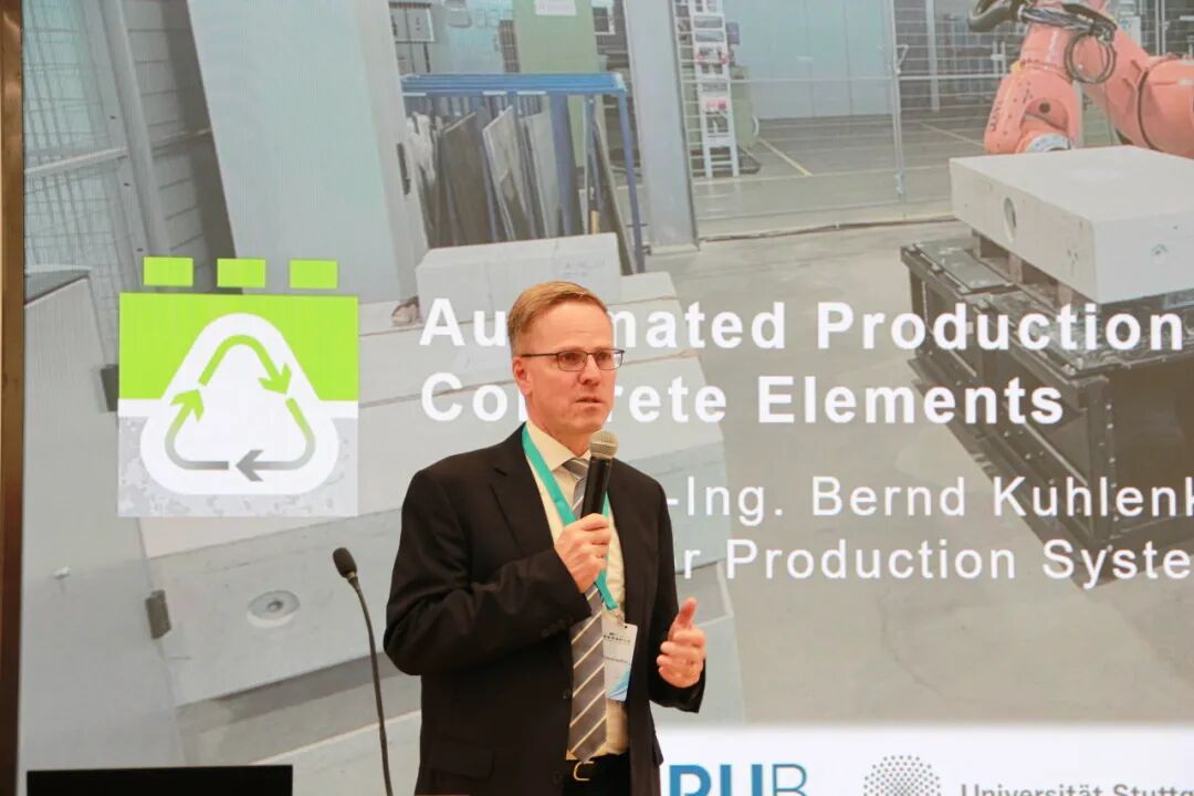 Bernd Kuhlenkoetter作了题为《Automated production system for the processing of concrete elements》的报告,深入探讨机器人与智能制造如何推动制造业实现绿色高效发展。他以制造加工自动化系统为例,介绍了通过构建能耗与加工特性仿真的耦合数字模型,实现生产全过程的自动化整合。该系统将精细加工环节融入整体价值链,实现全链路协同,有力推动制造业向智能化、高效化方向转型。