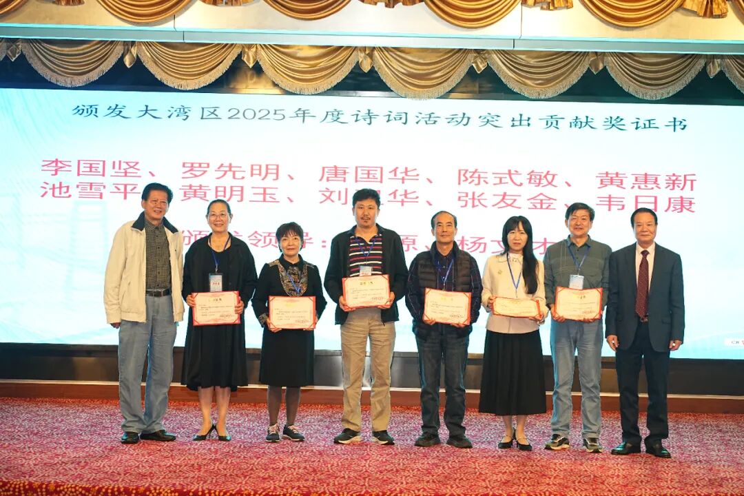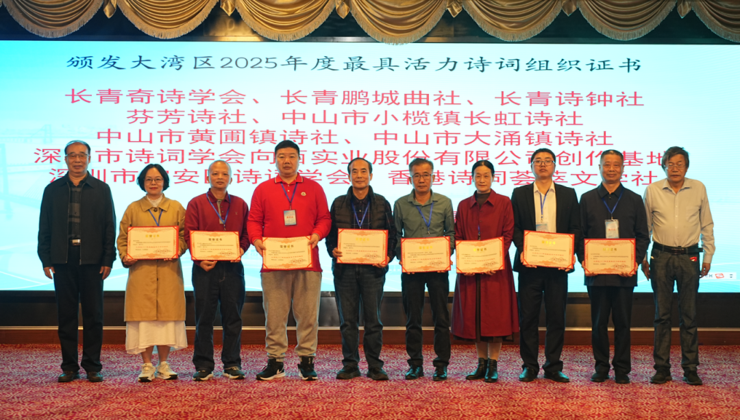 日前,刚刚结束的“凝聚诗词力量·赋能‘百千万工程’——粤港澳大湾区(2025中山)中华诗词创作采风活动”传来喜讯:深圳市宝安区诗词学会又荣获“最具活力诗词组织”称号。同时,学会收获个人荣誉颇丰:唐石成、熊玲燕二位荣获“大湾区2025年度诗词评论突出贡献奖”;池雪平、杨代勇二位荣获“大湾区2025年度诗词活动突出贡献奖”。