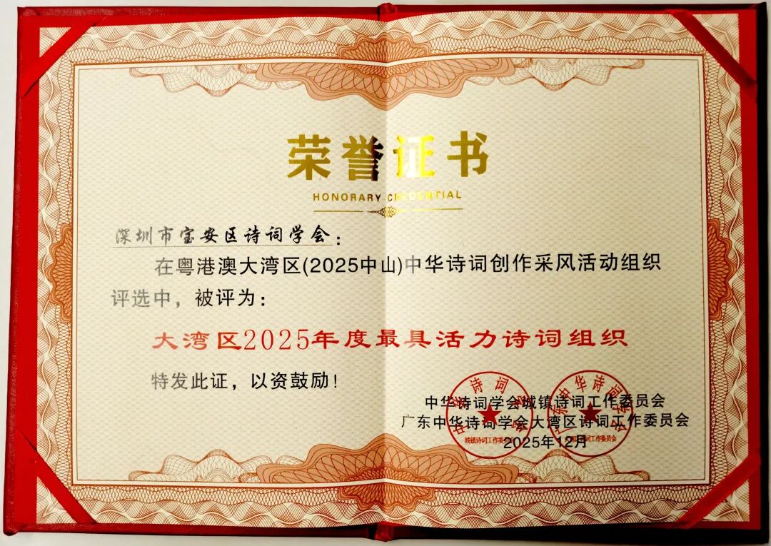 学会成立七年来,发展步履坚实,荣誉接踵而至:2021年,先后被广东中华诗词学会吸收为“会员单位”、被深圳市诗词学会吸收为“团体会员”,并获评宝安区文联系统“优秀单位”;并于2022年8月、2024年12月、2025年12月,三次蝉联由中华诗词学会城镇诗词工作委员会、粤港澳大湾区中华诗词文化论坛组委会授予的“大湾区最具活力诗词组织”殊荣。