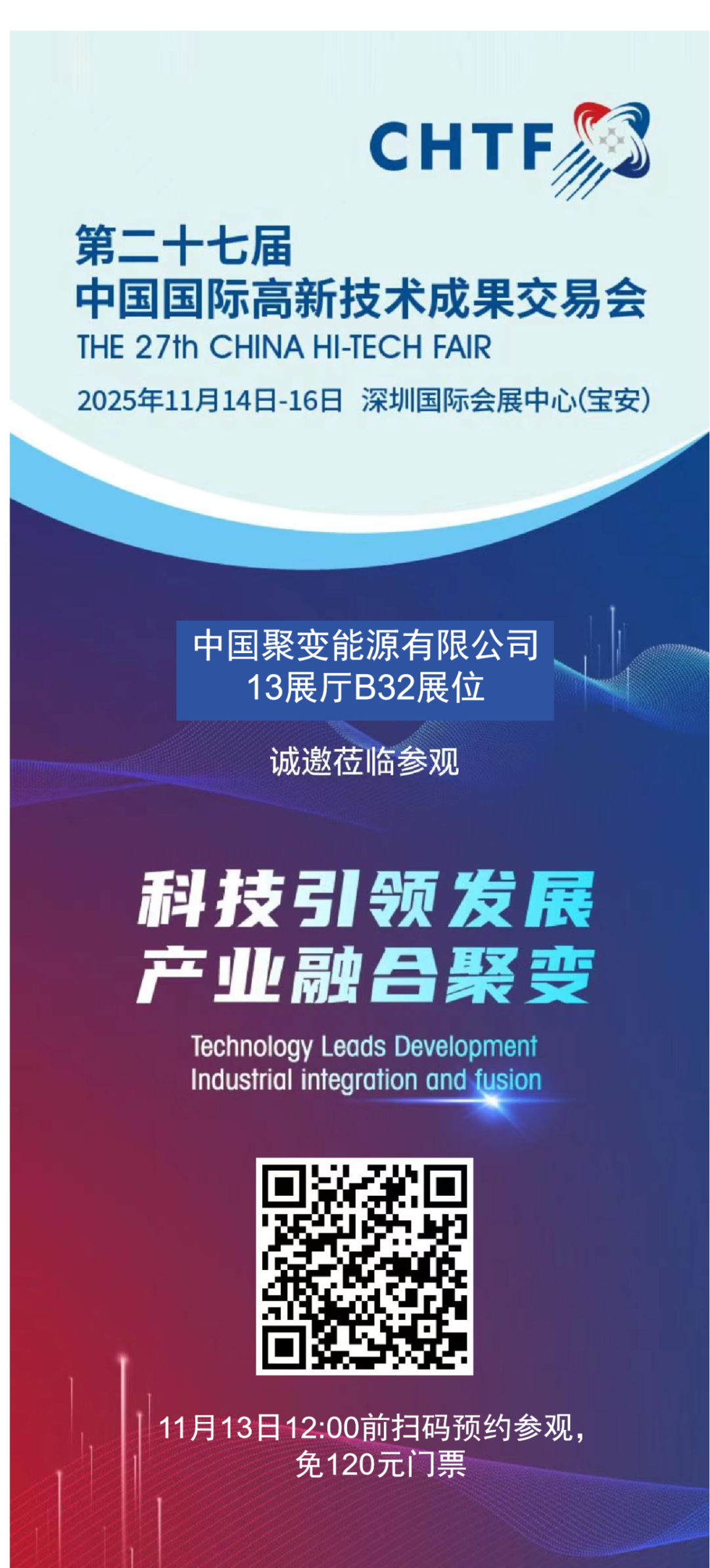第二十七届中国国际高新技术成果交易会(简称高交会),由深圳市人民政府主办,将于2025年11月14日—16日在深圳国际会展中心(宝安)举办。本届展会设置国之重器重大科技装备、科技巨头产业链、未来前沿科技、人工智能与机器人、半导体与集成电路、低空经济与空天、省市科技成果、国际科技成果、金融与资本投融资服务等专业展区。总展览面积40万平方米,预计有100 余个国家和地区的5000 余家知名企业与国际组织参展,全方位展示世界高新技术发展趋势,发布高新技术最新成果,并进行成果交易、投资与洽谈,是了解全球最新科技动态、感受中国创新力量的重要平台。中国聚变作为上海展团19家企业之一,位于13号展厅——省市科技展区国际友好城市科技展区,诚邀各合作伙伴相会深圳,共赴科技之约!