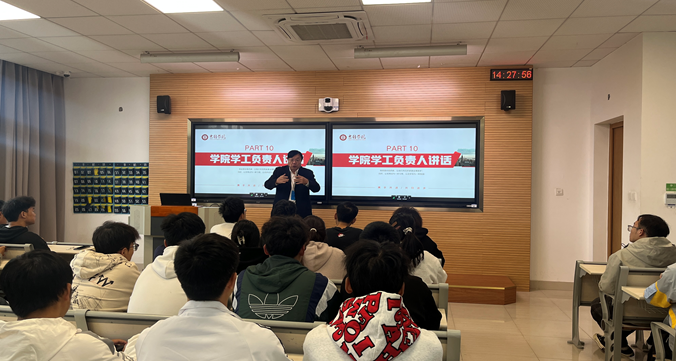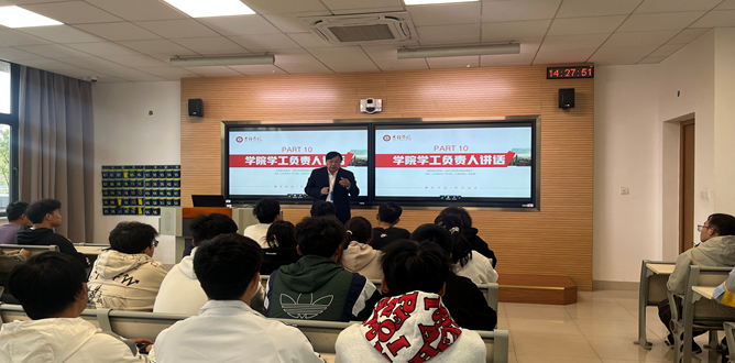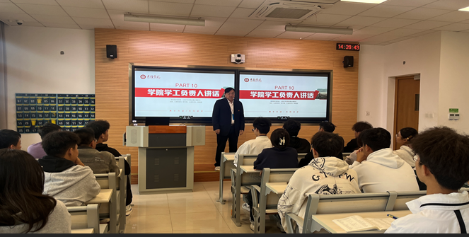 最后,陈忠斌副院长发表总结讲话。他首先高度肯定了本次启动仪式的意义与成效,赞扬班委的精心组织展现了良好的责任担当,同学们的热情参与体现了强烈的集体意识。随后,结合智能制造学院的发展规划与自身教育工作经历,就“如何建设优秀班集体”提出了三点宝贵建议:一是要筑牢学风建设根基,以专业学习为核心,通过设立学习目标、开展学习竞赛等方式,形成“比、学、赶、帮、超”的浓厚学习氛围;二是要突出班级特色,紧密结合机器人工程专业优势,将专业学习与班级活动深度融合,打造具有专业辨识度的班级亮点;三是要增强班级凝聚力,通过丰富的集体活动、温暖的互助行为,营造“团结友爱、包容互助”的家庭式氛围,让每个同学都能感受到集体的温暖。此外,陈副院长还针对同学们提出的问题进行了耐心细致的补充解答,并表达了殷切期望:“希望 2025 级机器人工程 1 班能以此次启动仪式为起点,凝聚共识、奋勇争先,成为智能制造学院的标杆班级,也希望每位同学都能在这个优秀的集体中,收获知识、收获友谊、收获成长,为未来的人生道路打下坚实基础。”