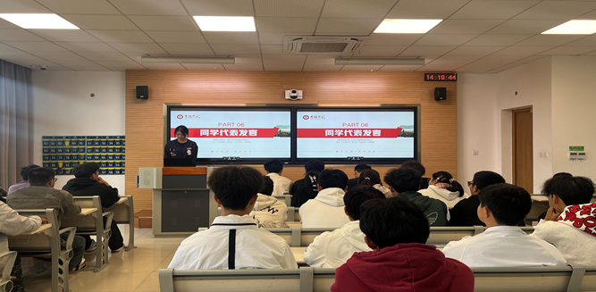 班委部署结束后,学生代表李美欣上台发言,她以“个人与集体共成长”为主题,从“我们每个人能为班级做些什么”的实际角度出发,向同学们提出了“上课认真听讲、主动帮助学习有困难的同学、积极参与班级活动、自觉维护班级荣誉”等行动建议。随后,她代表全班同学作出庄严承诺:“我们必将严格遵守班级公约,以高度的责任感对待集体事务,勤学笃行、互帮互助,不辜负学院领导和班主任的期望,用实际行动为将 2025 级机器人工程 1 班建设成为名副其实的优秀班集体贡献自己的全部力量!” 她铿锵有力的话语,不仅道出了全体同学的共同心声,更展现出同学们为班级建设全力以赴的坚定决心,赢得了现场阵阵掌声。