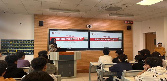 随后,学习委员郎靖惠上台,围绕 “学风建设” 这一核心,向同学们详细宣讲了“智能制造学院优良学风班评比条件”。她结合班级专业特点,逐条拆解了评比指标中关于学业成绩、课堂纪律、科技创新、学术活动参与等方面的具体要求,用清晰的数据和明确的标准,让同学们对“优秀学风班”的建设目标有了量化认知,也为大家在学习上的努力提供了明确方向与具体方案。