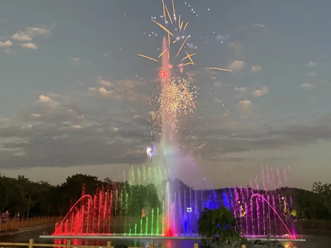 晚宴期间,生态园广场前的喷泉水幕灯光秀同步上演,灵动的喷泉与璀璨的灯光交织,生动放映出“龙腾盛世”的壮丽画面,引得现场嘉宾纷纷拍照留念;夜空之上,朵朵礼花次第绽放,绚烂的光芒将整个生态园映照得格外明亮,不仅为晚宴增添了喜庆氛围,更象征着鹏利隆集团与合作伙伴携手共进、未来可期的美好愿景。