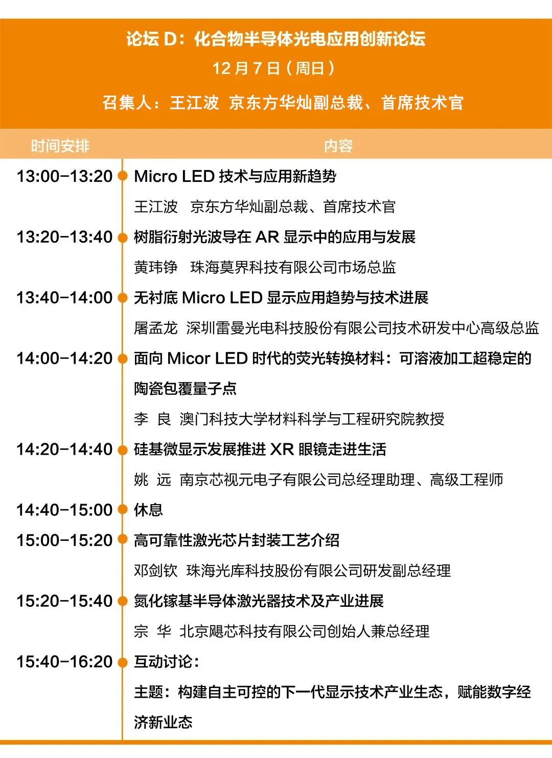 聚焦于化合物半导体在光电领域的革命性应用,核心议题包括Micro-LED的巨量转移与检测技术、产业化进程与成本挑战,激光器、消费电子、工业加工等领域的最新进展,旨在连接材料、芯片与终端应用,共同挖掘光电半导体的巨大市场潜力。