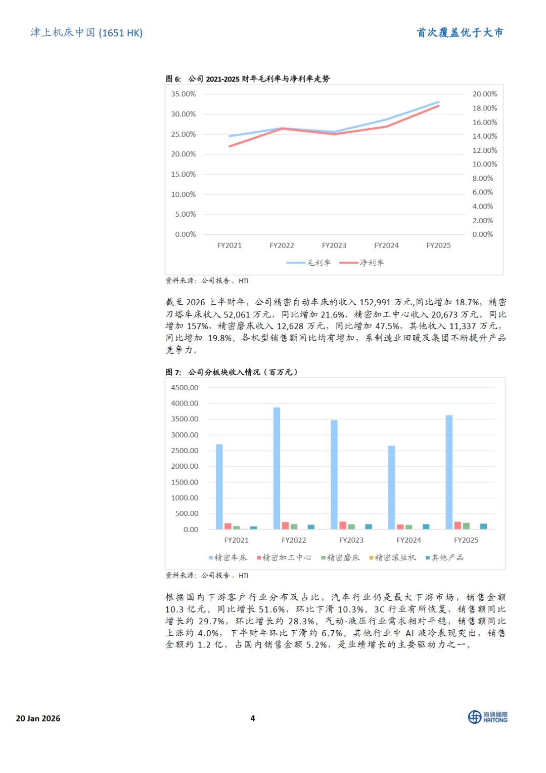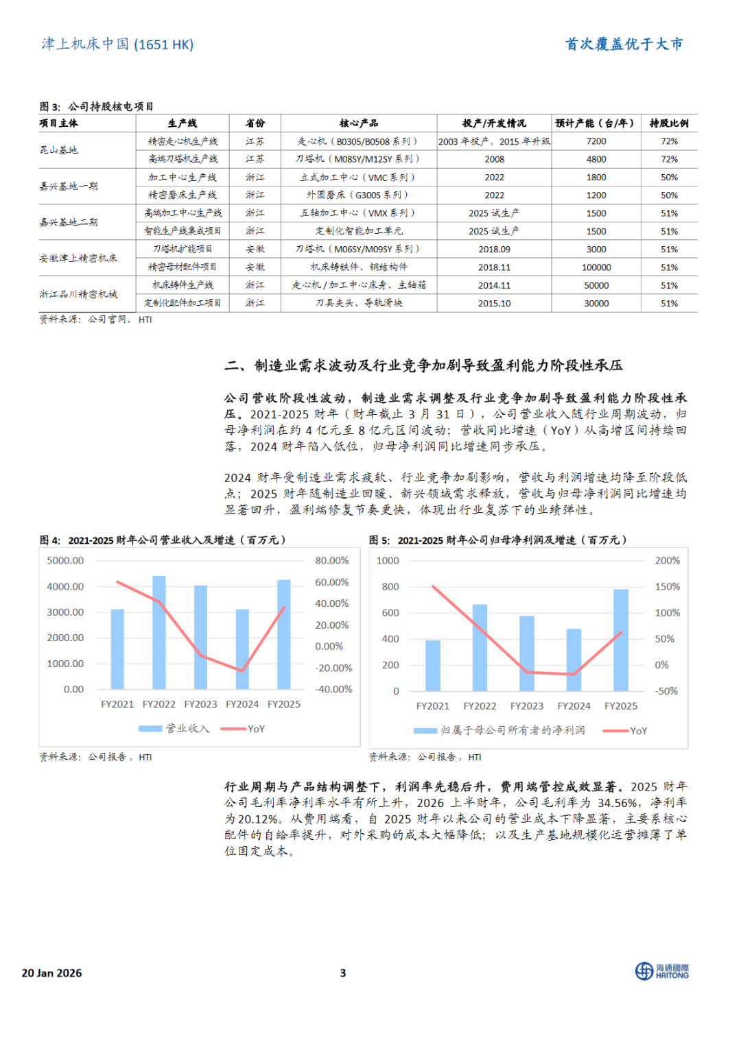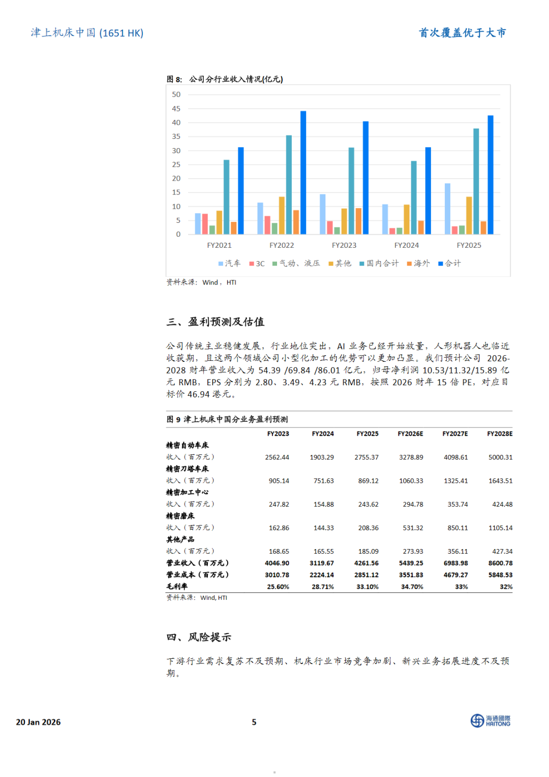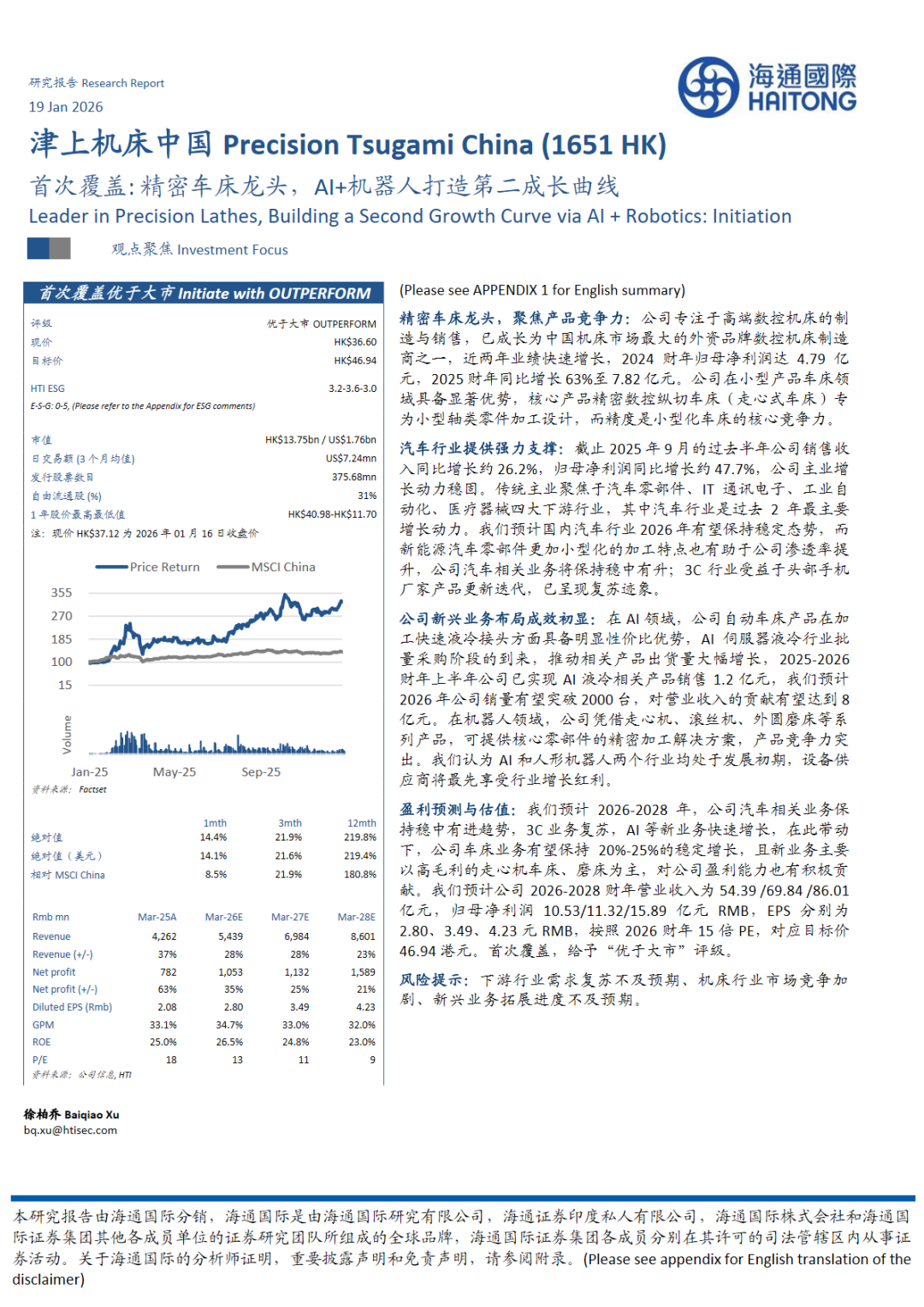 本篇行业报告可以通过扫下方知识星球下载。39元就可以下载星球所有报告。免费提供报告查找服务。海通国际近期发布了关于津上机床中国(Precision Tsugami China,股票代码:1651 HK)的研究报告,首次覆盖并给予“优于大市”评级,目标价定为港币46.94元。津上机床中国作为精密车床领域的龙头企业,凭借其在AI和机器人技术的应用,正在构建第二成长曲线,展现出强劲的增长潜力。报告指出,津上机床中国专注于高端数控机床的制造与销售,已成为中国机床市场最大的外资品牌数控机床制造商之一。公司在小型产品车床领域具有显著优势,核心产品精密数控纵切车床专为小型轴类零件加工设计,精度是其核心竞争力。汽车行业作为公司的主要增长动力,提供了强有力的支撑。随着新能源汽车零部件加工特点的小型化,公司的渗透率有望进一步提升。在新兴业务方面,津上机床中国在AI领域的自动车床产品展现出明显的性价比优势,特别是在AI伺服器液冷行业的批量采购阶段,相关产品出货量大幅增长。预计2026年公司销量有望突破2000台,对营业收入的贡献有望达到8亿元。在机器人领域,公司凭借其精密加工解决方案,产品竞争力突出,有望享受行业增长红利。盈利预测方面,海通国际预计2026-2028年,津上机床中国的汽车相关业务将保持稳中有进的趋势,3C业务复苏,AI等新业务快速增长。预计公司营业收入将达到54.39亿、69.84亿和86.01亿元人民币,归母净利润分别为10.53亿、11.32亿和15.89亿元人民币,EPS分别为2.80元、3.49元和4.23元人民币。风险提示方面,报告指出,下游行业需求复苏不及预期、机床行业市场竞争加剧、新兴业务拓展进度不及预期等因素可能对公司业绩产生影响。总体来看,海通国际对津上机床中国的未来发展持乐观态度,认为公司在精密车床领域的领先地位以及在AI和机器人技术的应用将推动公司业绩持续增长。免责声明:以上分享报告为公开合法渠道获得,内容大部分来源于网络,版权归原作者所有,如有侵权,请及时与我们联系,我们将第一时间保障您的权益。推荐内容仅供参考学习,不构成投资建议。