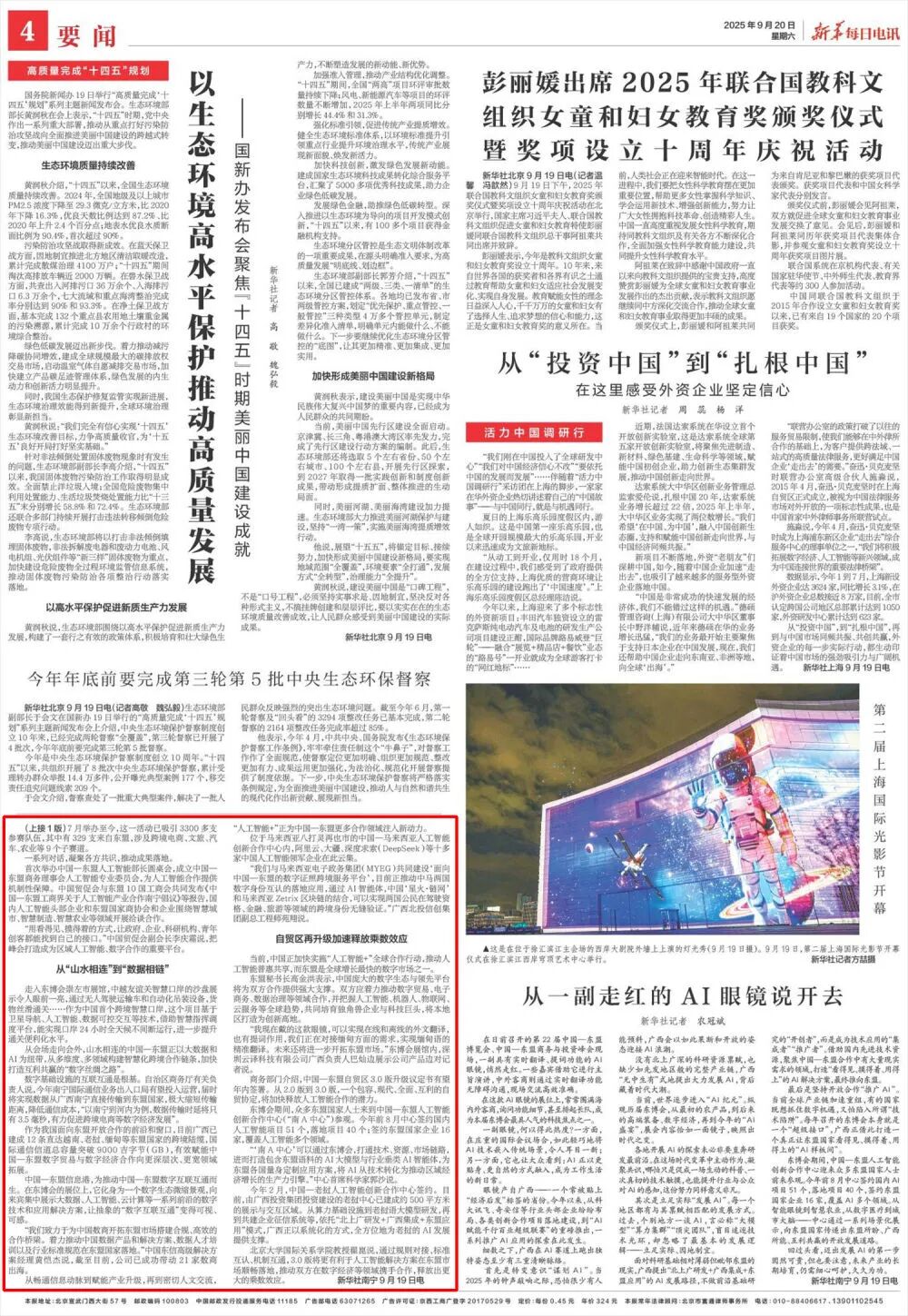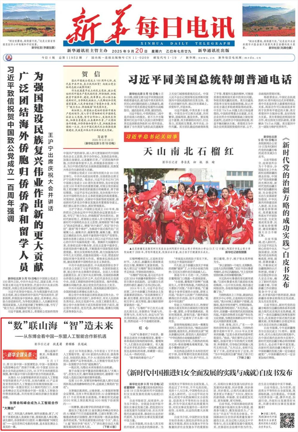 9月20日,新华每日电讯头版发布《“数”联山海 “智”造未来——从东博会看中国—东盟人工智能合作新机遇》文章。全文如下: