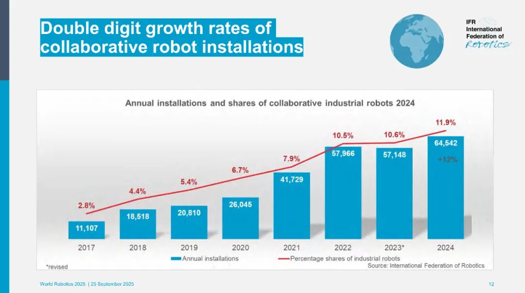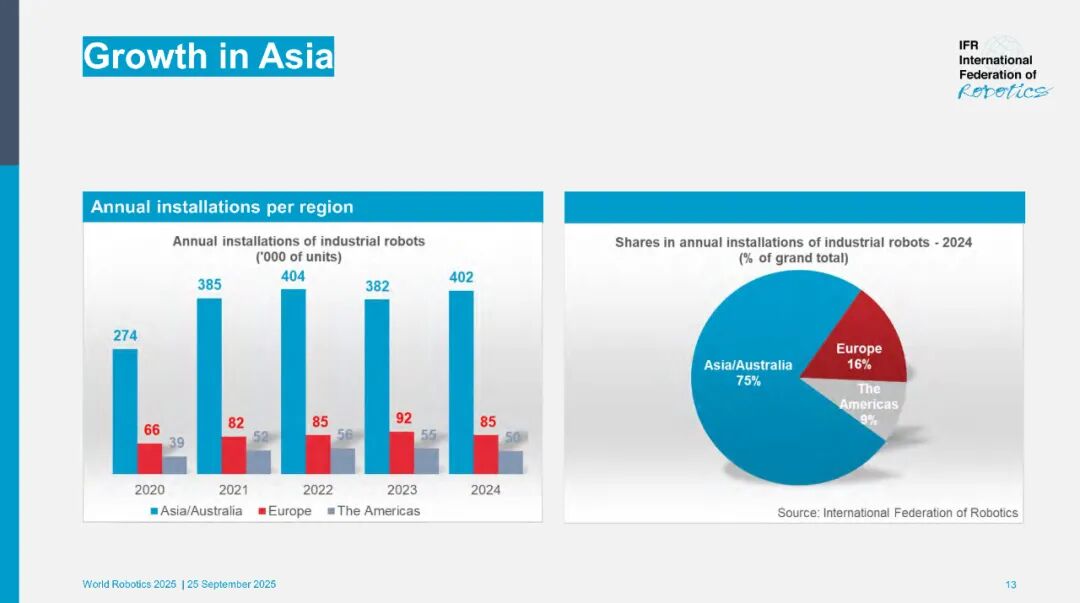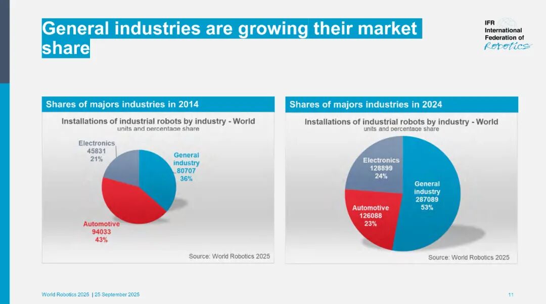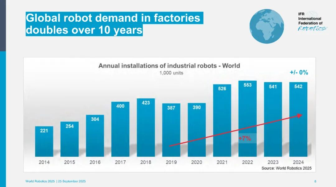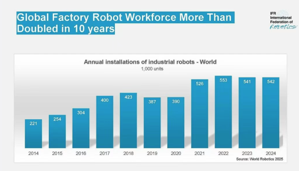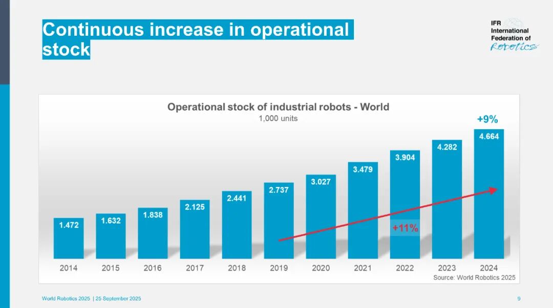 国际机器人联合会主席伊藤隆之表示:“2024年工业机器人年销量位居历史第二高位,仅比两年前创下的历史峰值低2%。随着众多产业加速向数字化与自动化时代转型,工业机器人需求呈现爆发式增长。2024年全球工业机器人在役总量达466.4万台,同比增长9%。”