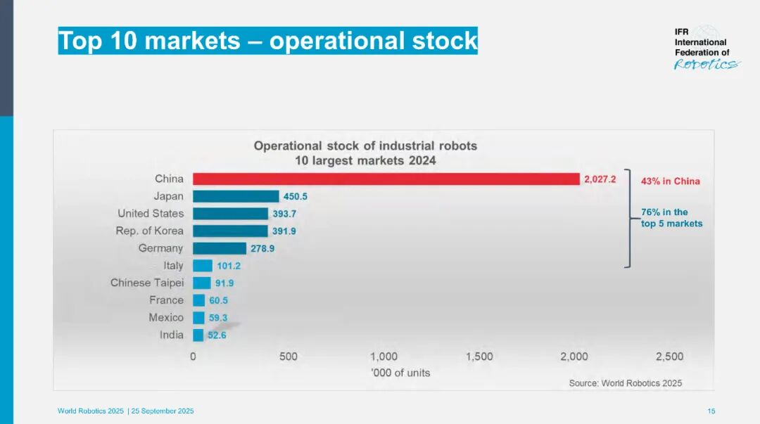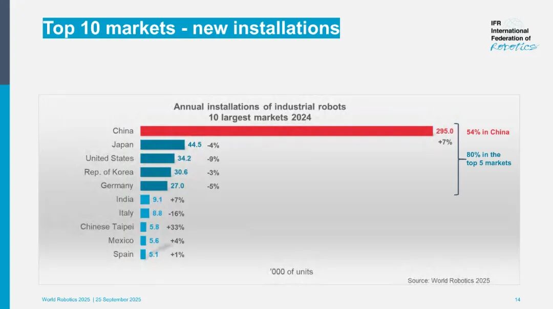 《2025年世界机器人报告》数据显示,2024年全球工业机器人销量达54.2万台,较十年前增长超过两倍。中国以54%遥遥领先的占比稳居2024年全球最大市场,最新数据显示销量达29.5万台,创年度新高。中国本土厂商首次在本国市场实现对外资品牌的超越,国内市场占有率从十年前的28%跃升至57%。