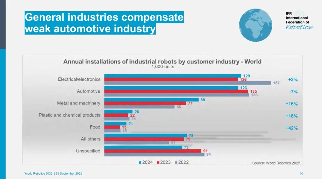 印度以9,100台销量创历史新高,同比增长7%。其中汽车制造业以45%的市场份额成为主要驱动力,印度在全球销量排名中位列第六,较往年上升一位,紧随德国。