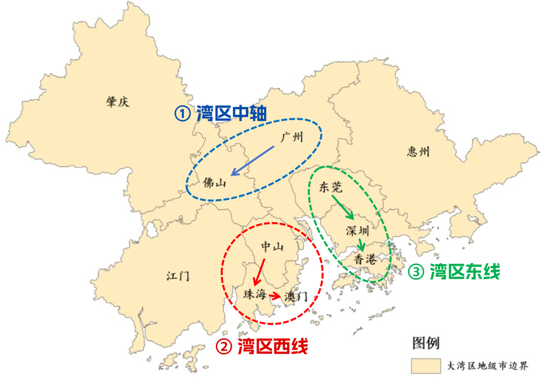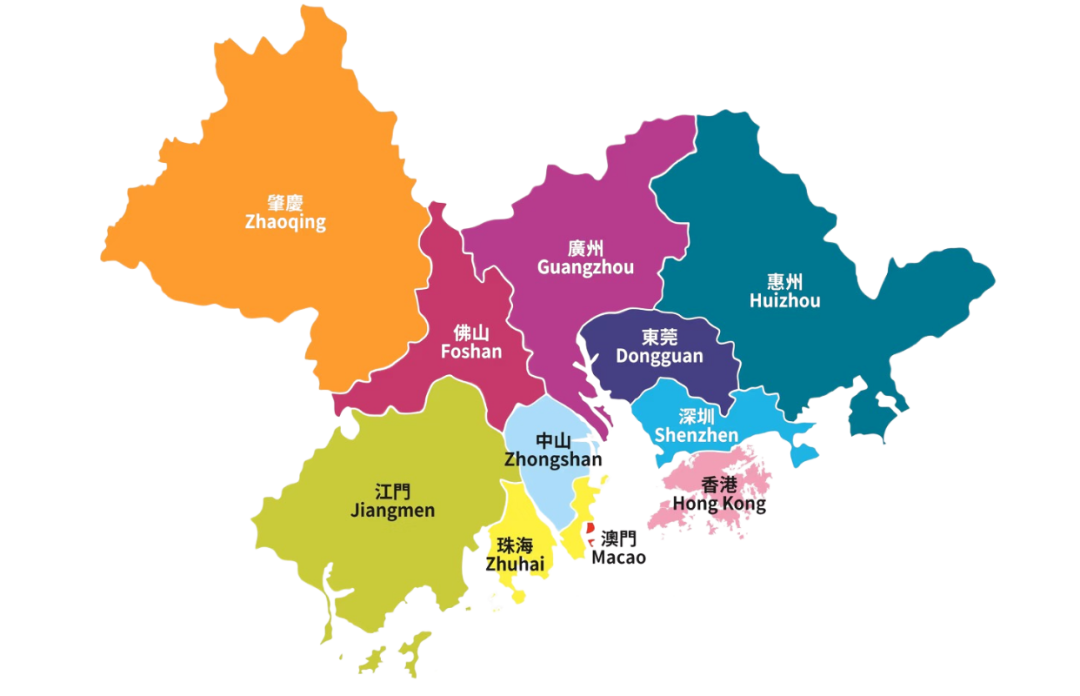 (粤港澳大湾区,Guangdong-Hong Kong-Macao Greater Bay Area,简称大湾区\GBA,由香港、澳门两个特别行政区和广东省广州、深圳、珠海、佛山、惠州、东莞、中山、江门、肇庆九个珠三角城市组成)