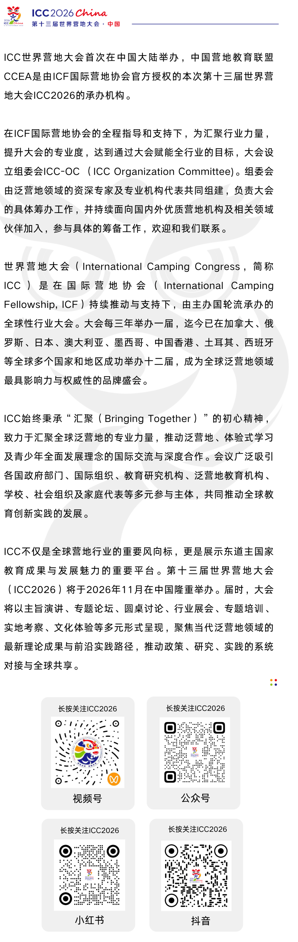 2026年11月,全球营地教育界的目光聚焦中国。在河北崇礼主大会(6-10日)之后,ICC2026第十三届世界营地大会粤港澳大湾区地区大会将在广州·永庆坊开启!