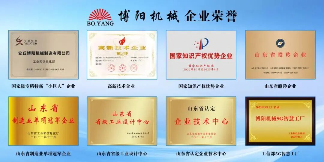 安丘博阳机械是工信部专精特新“重点小巨人”企业、国家高新技术企业、国家知识产权优势企业、山东省瞪羚企业、山东省制造业单项冠军企业。