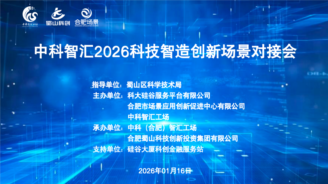 2026年1月16日下午,由合肥市科学技术局、蜀山区人民政府指导,蜀山区科学技术局、科大硅谷服务平台有限公司、合肥市场景应用创新促进中心有限公司、中科智汇工场等单位联合主办的 “中科智汇2026科技智造创新场景对接会” 在合肥望江路硅谷大厦成功举行。