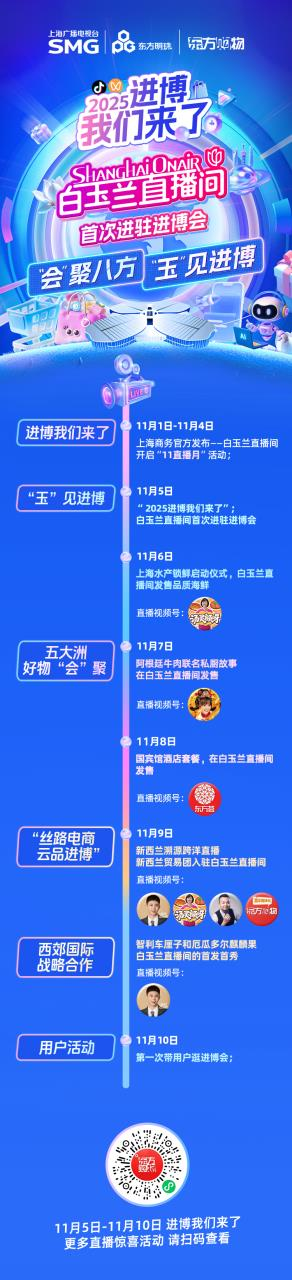 白玉兰直播间以"移动+实体"双线模式全面发力,80多名直播团队人员将在进博场馆内进行超450小时直播,18个白玉兰矩阵账号将连续6天不间断直播,从早到晚为大家介绍进博好物、丝路云品,全球首发、国际潮牌,探索"线上线下融合逛展"新样态,为用户带来全方位的"云逛展"新体验。