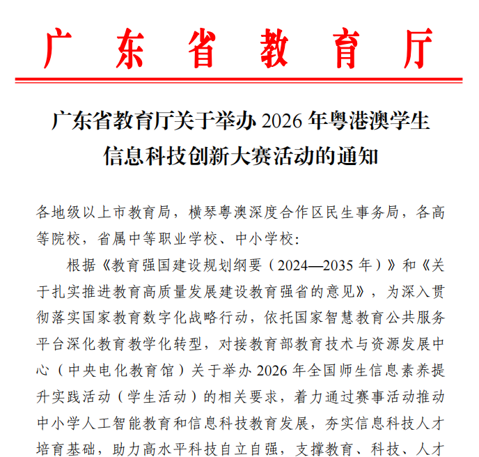 为深入落实国家教育教学化战略,推动中小学人工智能教育与信息科技创新教育的发展,广东省教育厅联合珠海市人民政府、香港、澳门特区教育局等多方力量,正式启动 “2026 年粤港澳学生信息科技创新大赛”。本届大赛以 “创想、创作、创新、创造——迎接人机共智美好未来” 为主题,旨在打造粤港澳大湾区科创教育协同发展的全国性品牌,为三地学生搭建一个展示信息素养与科技创新能力的广阔舞台。