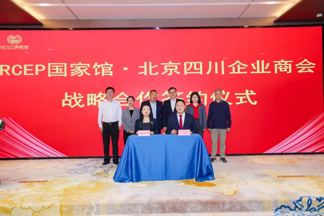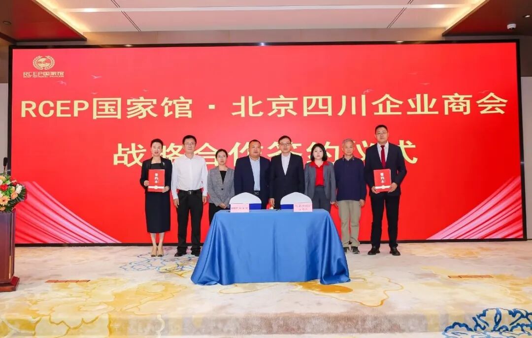 致辞结束后,签约仪式正式启动。首先,RCEP国家馆总裁许静芬与北京四川企业商会党支部书记兼秘书长李雄作为签约代表上台,签署战略合作协议,双方将聚焦企业出海核心需求,在RCEP市场对接、跨境资源整合、出海服务升级等方面开展深度合作。深圳市盐田区企业服务中心副主任刘丹,北京四川企业商会会长刘东海,深圳市四川商会执行会长张松明,深圳南部县商会会长汪家继,深圳市绵阳商会副会长苏美,深圳市四川内江商会秘书长曾庆银受邀上台,共同见证这一重要时刻。党支部书记牵头签约、核心领导层共同见证,既体现了商会党组织在统筹出海资源、引领企业开拓国际市场中的核心作用,也彰显了商会推动会员企业对接RCEP市场、拓展跨境合作的坚定决心。双方握手落笔的瞬间,现场掌声雷动,这一意义深远的合作瞬间被永久定格,标志着政企协同、党建引领下的企业出海服务体系又添坚实纽带。