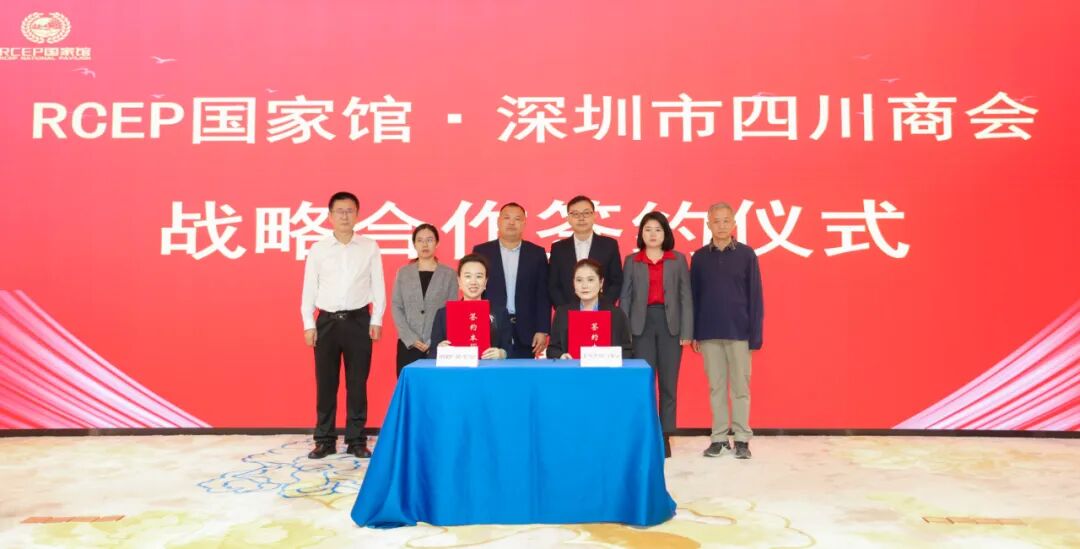 致辞结束后,我会与北京四川企业商会分别与RCEP国家馆签署战略合作协议。深圳市盐田区企业服务中心副主任刘丹、北京四川企业商会会长刘东海、深圳市四川商会执行会长张松明、深圳南部县商会会长汪家继、深圳市绵阳商会副会长苏美,深圳市四川内江商会秘书长曾庆银受邀上台,共同见证这一重要时刻。