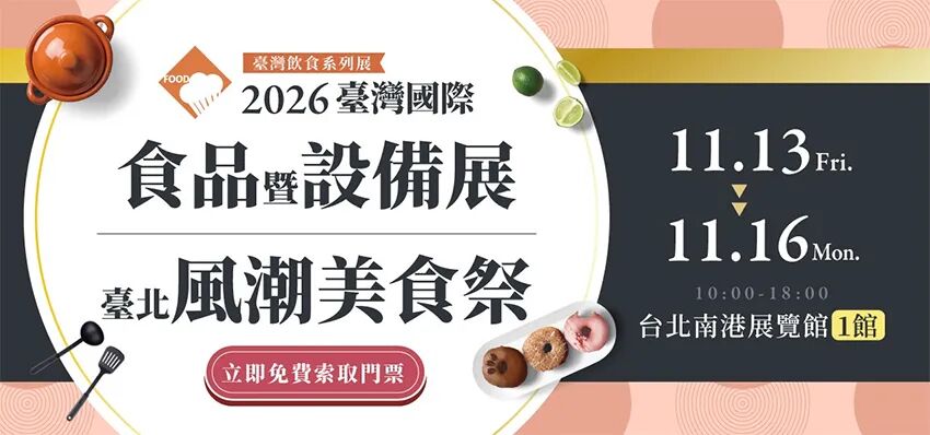 📝简介:台湾国际食品暨设备展,每年都吸引了许多来自国内外的专业人士来台采购参观,堪称亚洲不可错过的食品盛会。上届展会总面积40000平方米,参展企业1400家均来自日本、韩国、新加坡、泰国、德国、意大利、印度等,参展人数达61803人。台湾是中国第一大岛。食品是民生的基础,台湾食品产业经理数十年的发展,已有早期产品初级加工、外销出口转向支持工业及产业发展之政策方向,逐渐转为满足国内食品需求。提高国民生活素质为主。近几年,消费者越来越重视养生保健,更要求生活便利性。台湾国际食品展览会,以提供优质健康便利食品、满足国人膳食保健需求为主要发展目标。2026台湾国际食品暨设备展,将于2026年11月13-16日在台北南港展览馆(台北市南港区经贸二路1号)盛大启幕!