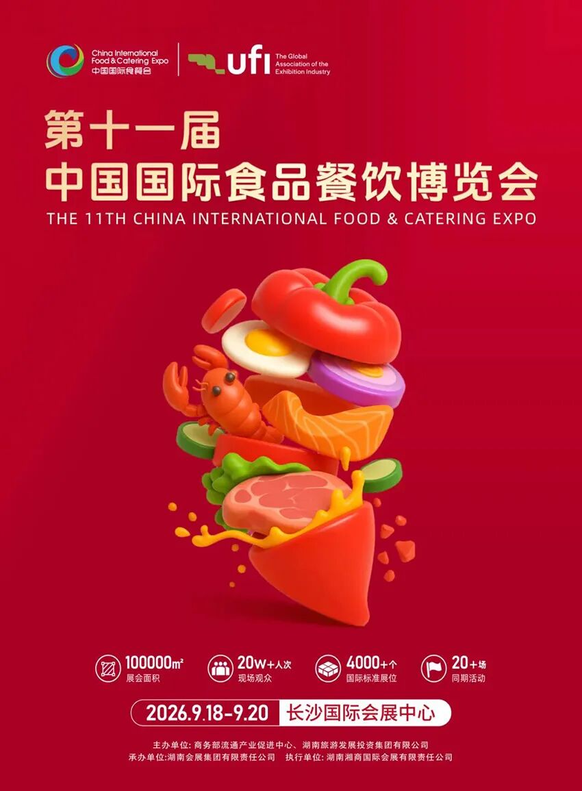 📝简介:2026第十一届中国国际食品餐饮博览会(以下简称“中国食餐会”)将于9月18日至20日在长沙国际会展中心(W1-W4馆、E1-E4馆)举行。展会以“促进消费 创新发展”为主题,紧密围绕“绿色、环保、安全、升级”理念,通过产品展销、对接洽谈、消费体验等形式,促进投资、贸易、消费等业态充分融合,为食品餐饮行业高质量发展搭建平台。本届展会专业展区提质升级涵盖餐饮、食材、粮油、咖饮、预制菜、进口及休闲食品、复合调味品等,并设有智慧餐饮、酒店用品、生产包装设备、厨房设备、连锁加盟等专业展区,打通了食品餐饮上下游产业链,使食餐会成为一个贯穿食品餐饮行业全产业链的商务平台。展会规模10万平方米,设置专家论坛、赛事评比、对接会等20余场专业活动,预计观众将达20余万人次。