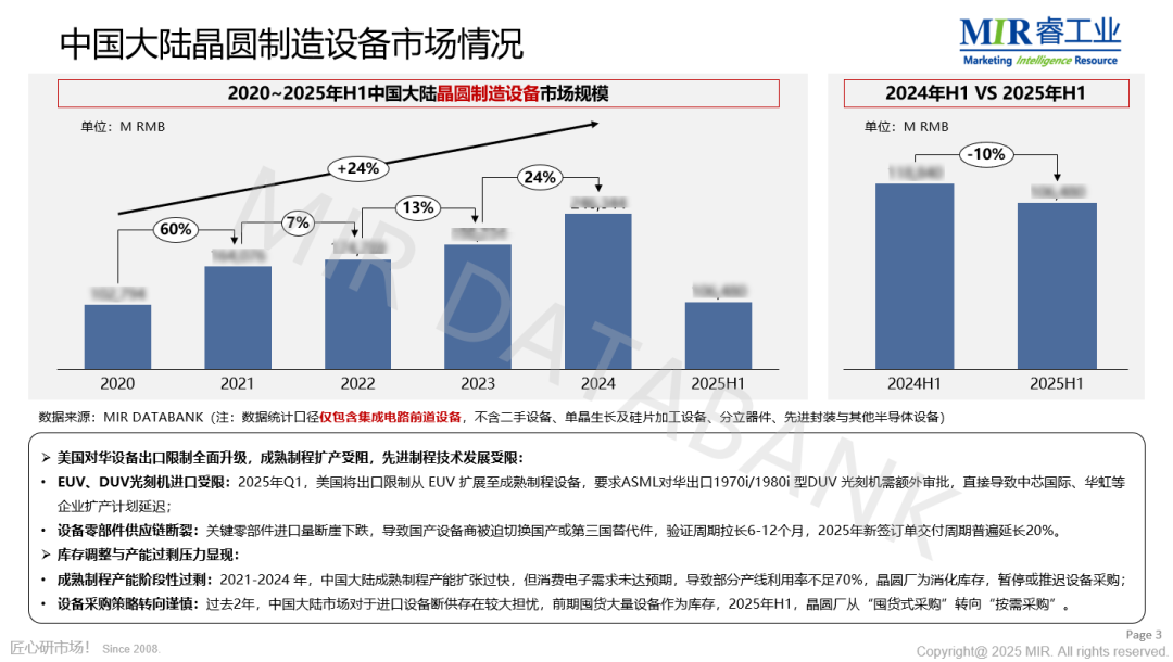 2025年上半年中国半导体设备市场呈现“分化”特征。其中晶圆制造设备市场表现承压,出现两位数下滑,核心原因包括先进制程设备进口受限、晶圆厂库存消耗与产能调整,导致企业采购策略趋于谨慎;与之相反,封装测试设备市场增长强劲,上半年增速达6%,主要驱动力来自先进封装技术的推广,AI需求爆发推动封装测试在芯片制造环节的重要性提升,进而拉动设备需求。
