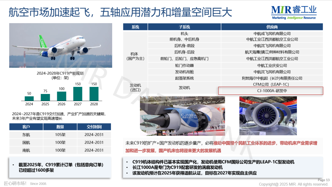 在下游核心应用行业中,航空航天领域需求稳定且受政策导向,对设备精度要求高,既是国产厂商的替代机遇,也对技术能力提出挑战;新能源汽车带动三电相关部件加工需求,传统油车改造项目也贡献设备采购量;模具领域存在“高端依赖进口、低端产能过剩”的矛盾,中国高端精密模具的技术与质量仍需提升;医疗领域对精密五轴机床需求明确,但中国企业参与度低,市场主要被德马吉等外资品牌占据。