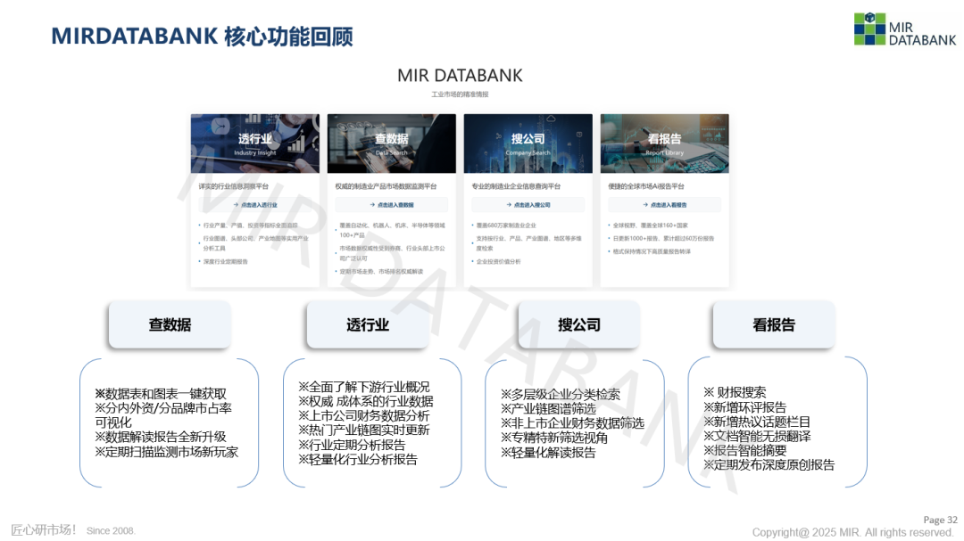 MIR DATABANK一直围绕“查数据、透行业、搜公司、看报告”四大模块进行版本强化与迭代,目前已覆盖七大行业、近百条产品线,定期监测厂商超1000家,成为业内规模领先的市场数据发布平台之一,能为用户提供从基础数据到深度信息的全链条支持。