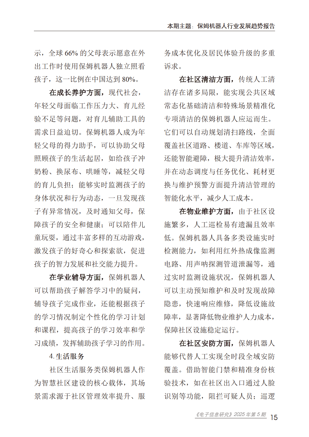 行业发展现状呈现稳步增长态势。全球家庭机器人市场规模从2022年的2133亿元增至2024年的2577亿元,复合年增长率达9.9%。区域市场中,北美占据高端市场主导地位,欧洲在老年照护和陪伴机器人领域需求强劲,中国和日本因老龄化严重、劳动力成本高成为增长最快的地区。应用场景聚焦智慧康养、智慧家庭、家庭教育和社区生活服务四大领域,其中智慧康养需求最为迫切,可满足老年人日常生活照料、健康管理、情感陪护和紧急救助等多元需求;家庭教育领域市场潜力巨大,中国80%的父母愿意使用保姆机器人照看孩子。